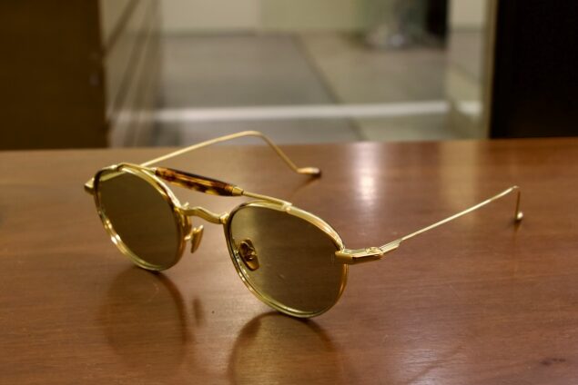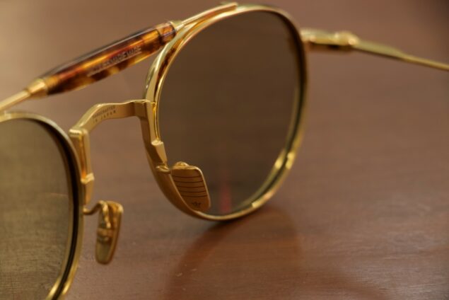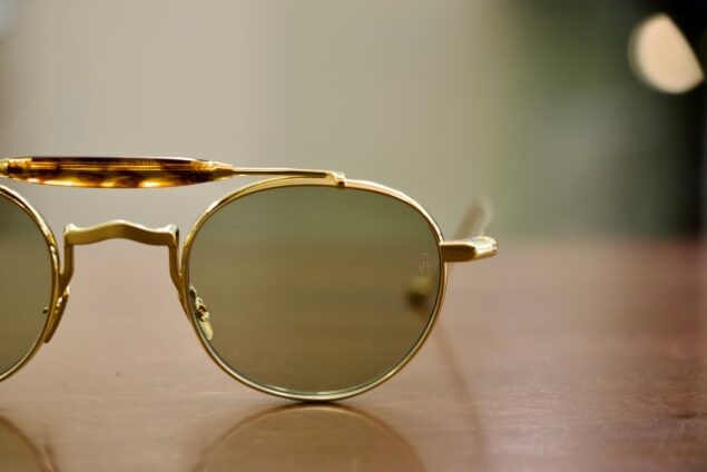 ブラウンとグリーンを織り交ぜたような“Light Bottle Green”と呼ばれるレンズはゴールドのフレームとの相性が良く、
