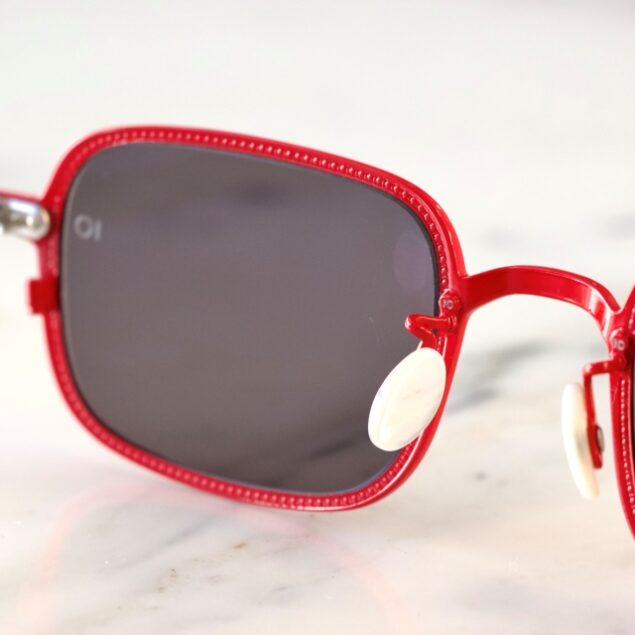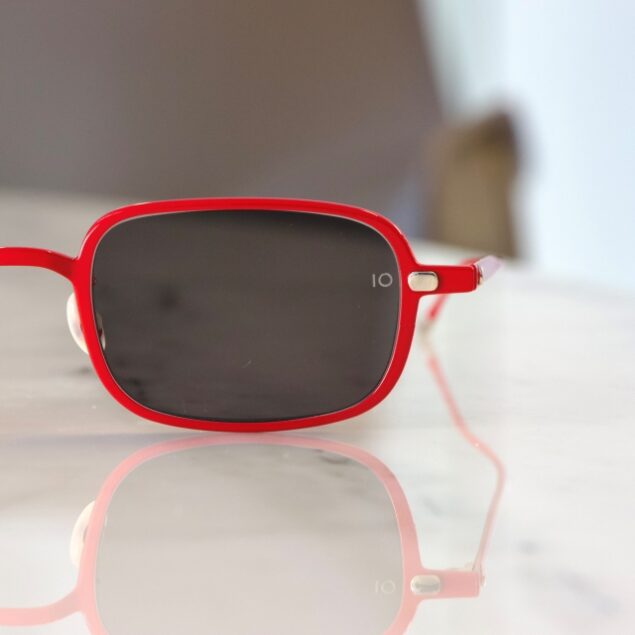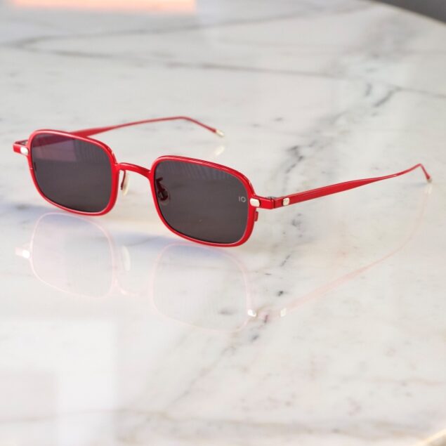 鮮やかな赤色に合わせ、落ち着いたグレーカラーのレンズを組み合わせ大人な雰囲気に仕上げています。