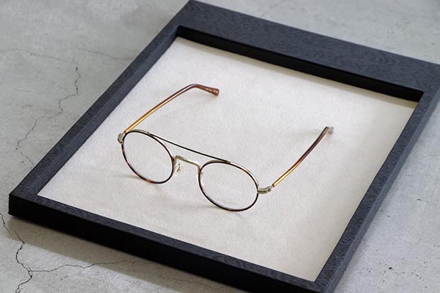 繊細な彫刻が施された金属パーツと上品な色合いをもつアセテートフレーム