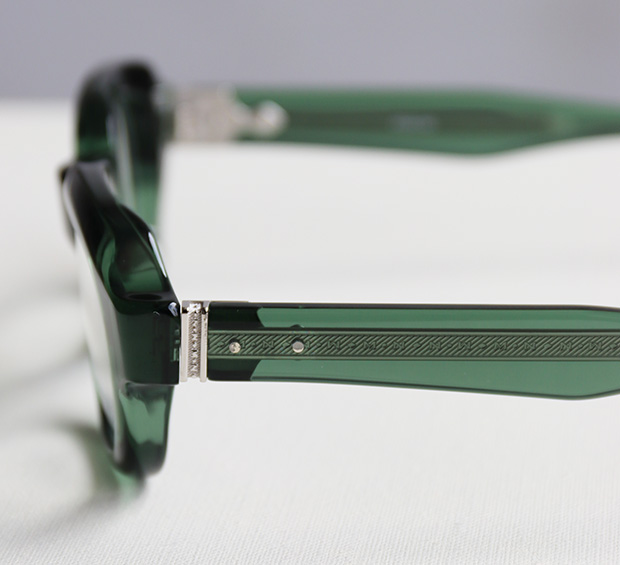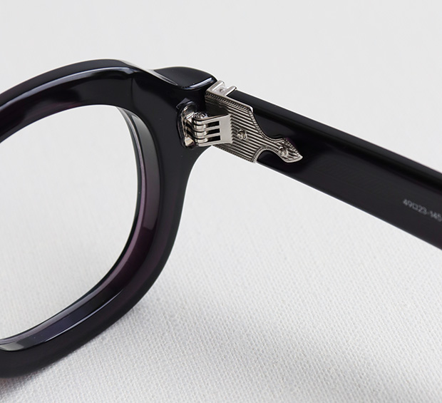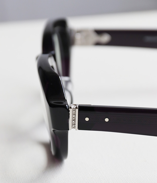 テンプルや蝶番にはブランドらしい彫金が施されていながらも、フロントはメタルパーツの装飾を抑えており、すっきりとした印象です。
