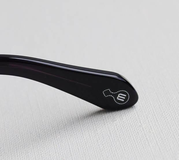 フロントとテンプルのつなぎ目からテンプルに掛けてはブランドのイニシャルが印字されたメタルパーツを採用。