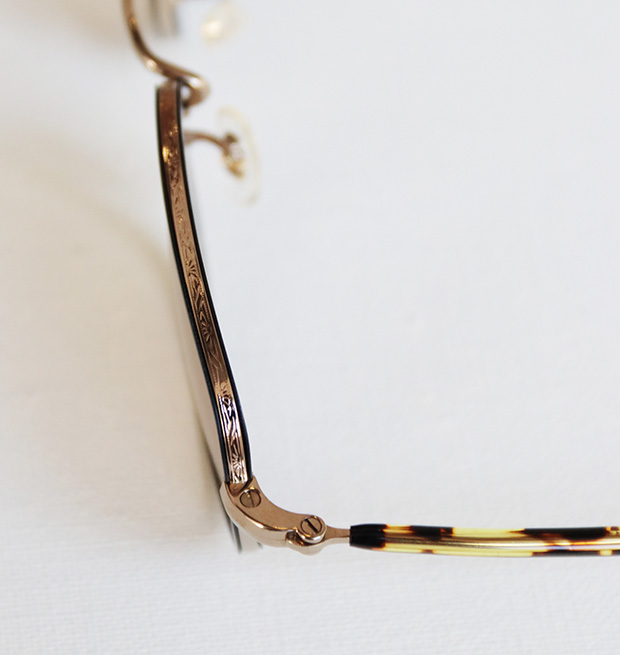 フロントはブラックとゴールドの組み合わせでテンプルはイエローデミ柄。
