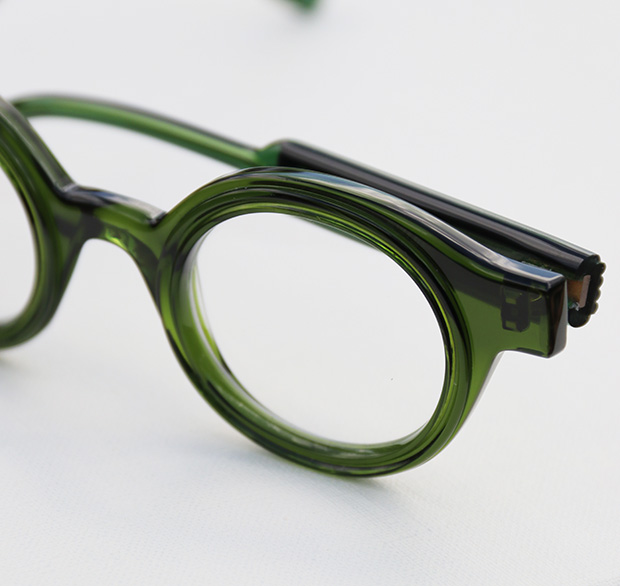 ベーシックなラウンドフレームにひと癖加えたデザインは存在感があり、立体的で奥行きのある表情を作り出しています。