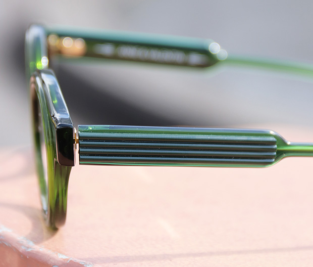 横向きのラインが刻まれた厚みのあるテンプルは、彫刻のような立体感のあるデザインに仕上げられています。