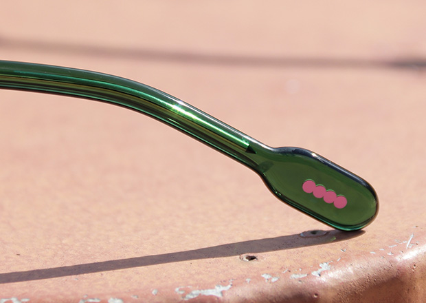 テンプルエンドの先端には、アンバレンタインらしい遊び心を感じる鮮やかなピンクのドット。