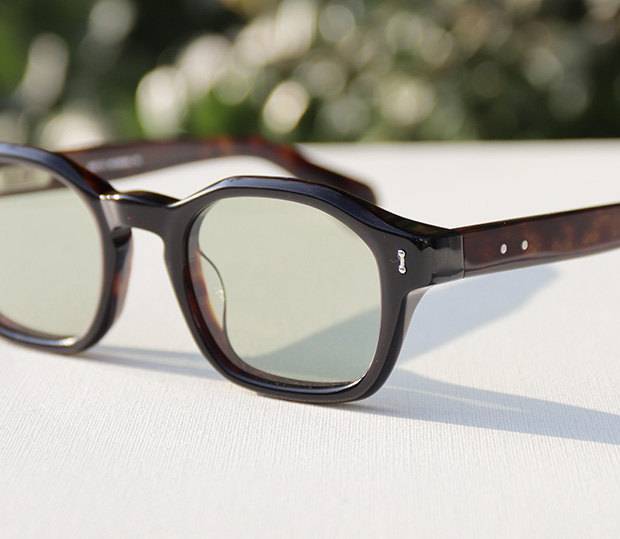 肉厚なアセテートフレームが生み出す存在感はありながら、どこか力の抜けた雰囲気を感じさせる一本です。
