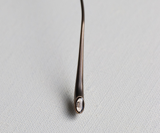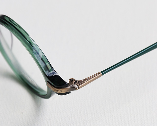 フロントとテンプルを繋ぐ部分には彫金模様の入ったメタルパーツ、テンプルエンドにはブランドのイニシャルである”M”の文字が刻印されています。