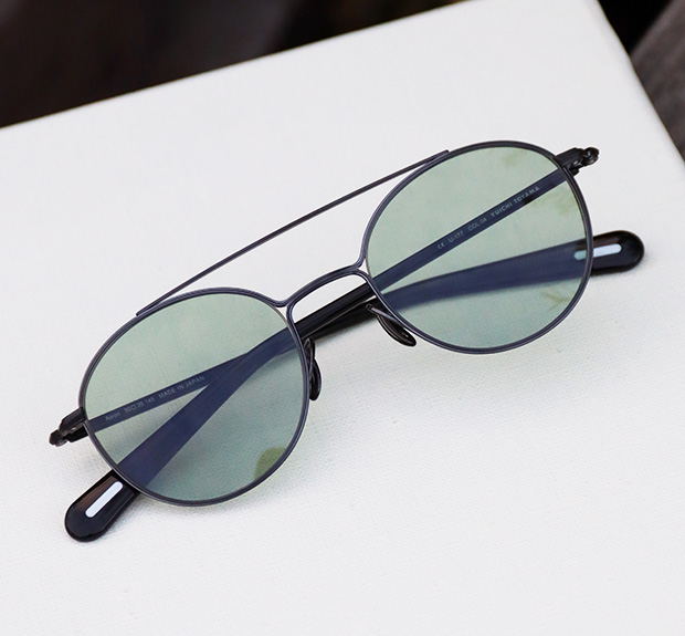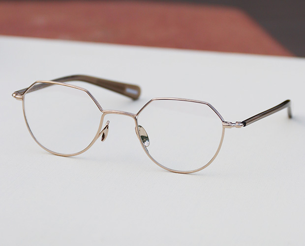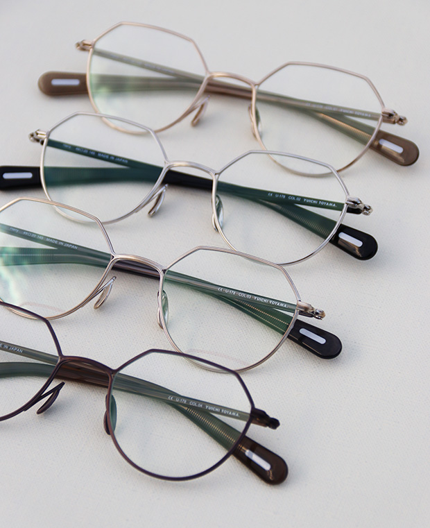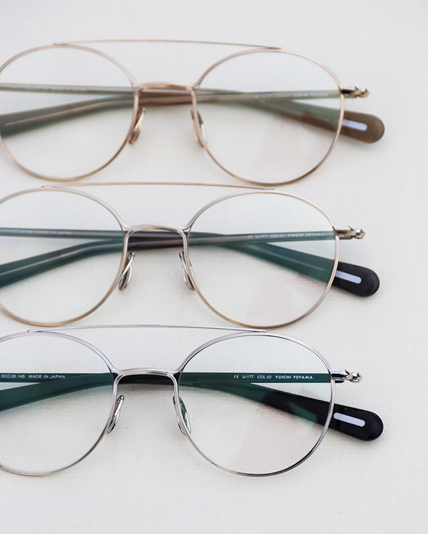 簡単に掛け外しができる半掛けテンプルに“つままれた”ような細いヨロイと合口は、独自の遊びがあるアンバランス感でYUICHI TOYAMA.のニュービンテージを提案しています。