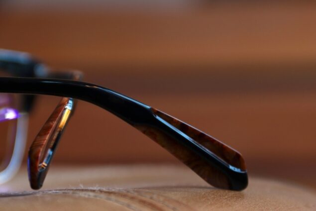 テンプル内側、ウッド調の生地がアクセントになったテンプルエンド。