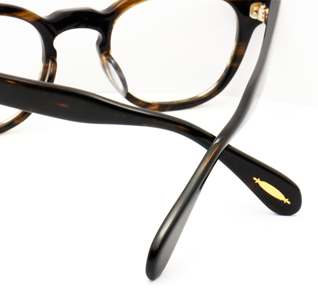 テンプルの中芯はブランドロゴの彫金が施されています。画像のササ柄のようなべっ甲系のカラーだと視認できるのですが、濃いブラックカラーだと視認できない少し贅沢な仕様です。